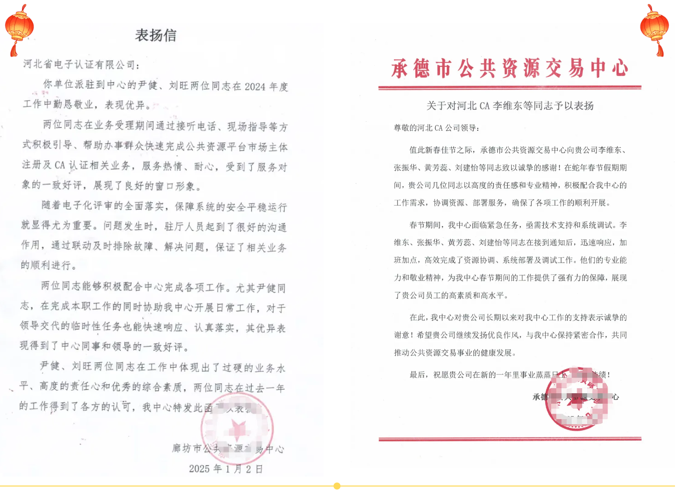 “勤懇敬業(yè),服務熱情”,這是來自廊坊市公共資源交易中心送來的表揚信上的話語。尹健、劉旺兩位同志在業(yè)務受理期間通過接聽電話、現(xiàn)場指導等方式積極引導、幫助辦事群眾快速完成公共資源平臺市場主體注冊及CA認證相關業(yè)務,服務熱情、耐心,受到了服務對象的一致好評,展現(xiàn)了良好的窗口形象。承德市公共資源交易中心同樣送來了表彰,“劉建怡、張振華、李維東、黃芳蕊等同志細致入微的堅守為我中心春節(jié)期間的工作提供了強有力的保障,展現(xiàn)了貴公司員工的高素質(zhì)和高水平。”正是這份“急客戶之所急,解客戶之所難”的初心,讓我們收獲了這份沉甸甸的認可。