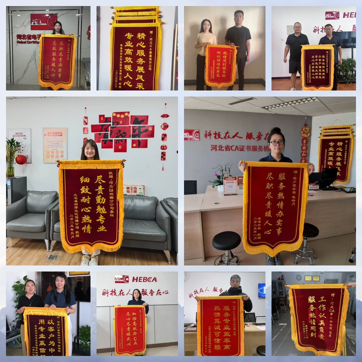 除了政務、醫(yī)療領域,來自企業(yè)和個人用戶的認可也從未間斷。我司眾多服務人員始終把客戶需求放在首位,甘愿犧牲個人休息時間,即便到了深夜十點多,仍會為有緊急需求的用戶答疑解惑、加急辦理業(yè)務,周末假期也常能看到大家到崗辦公的身影,竭盡所能為用戶解決認證難題。證書管理部李哲連夜趕到公司等候客戶辦理 CA、唐山分公司王琪、呼叫中心馮博倫、廊坊分公司尹健利用假期加班指導申請并制作招投標證書,正是這份堅守的生動縮影。有小微企業(yè)主在表揚信中寫道:“河北CA的服務太貼心了,從證書辦理到后續(xù)維護,全程指導,通俗易懂,解決了我們不懂技術的難題”;有個人用戶特意送來錦旗,感謝我們的服務人員耐心解答疑問,高效辦理業(yè)務,省去了來回奔波的麻煩。