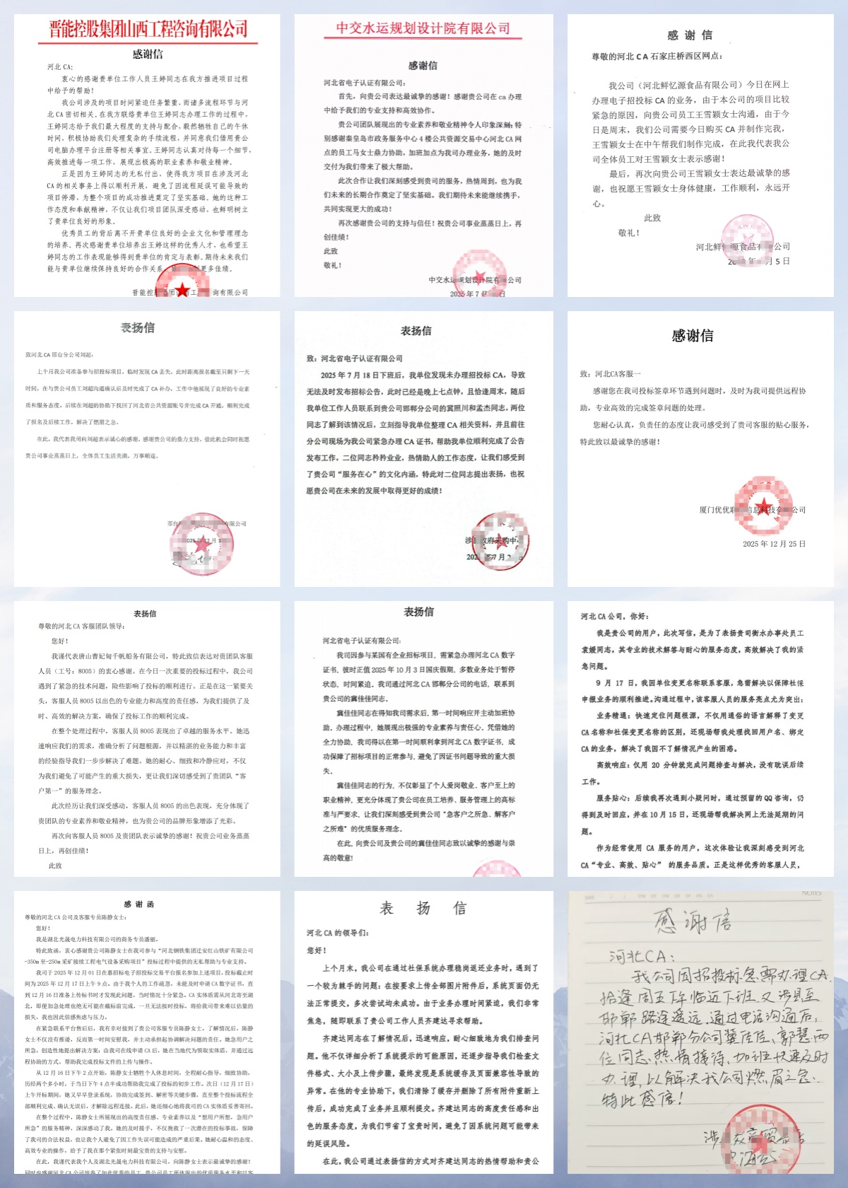 回望2025年,對于河北CA而言,是深耕服務、收獲認可的一年,更是與每一位客戶雙向奔赴、共赴成長的一年。這一年里,我們的辦公桌上,漸漸堆滿了來自四面八方的驚喜——40余封飽含深情的表揚信、10余面熠熠生輝的錦旗,它們來自公共資源領域、醫(yī)院機構的合作伙伴,來自深耕實業(yè)的大小企業(yè),也來自信賴我們的每一位個人用戶,每一面錦旗、每一行字跡,都是對河北CA服務最真摯的肯定,更是我們前行路上最珍貴的動力。